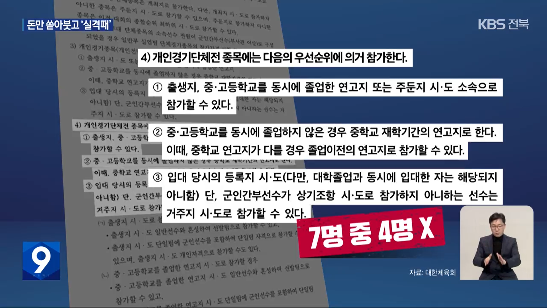 10월 23일 KBS전주총국은 이번 전국체전에서 “배드민턴 남자 일반부 선수들은 경기 한번 뛰지 못하고 실격패를 당하는 수모를 겪은 것으로 드러났다.”라고 보도했습니다. 도내에 실업팀이 없어 국군체육부대 소속 선수 7명을 전북 선수로 영입하고 출전 수당 등 명목으로 천백만 원이 넘는 비용까지 사용했는데, 7명 중 4명의 주소지가 전북이 아니어서 대회 규정상 전북 선수로 띌 수 없었던 겁니다.