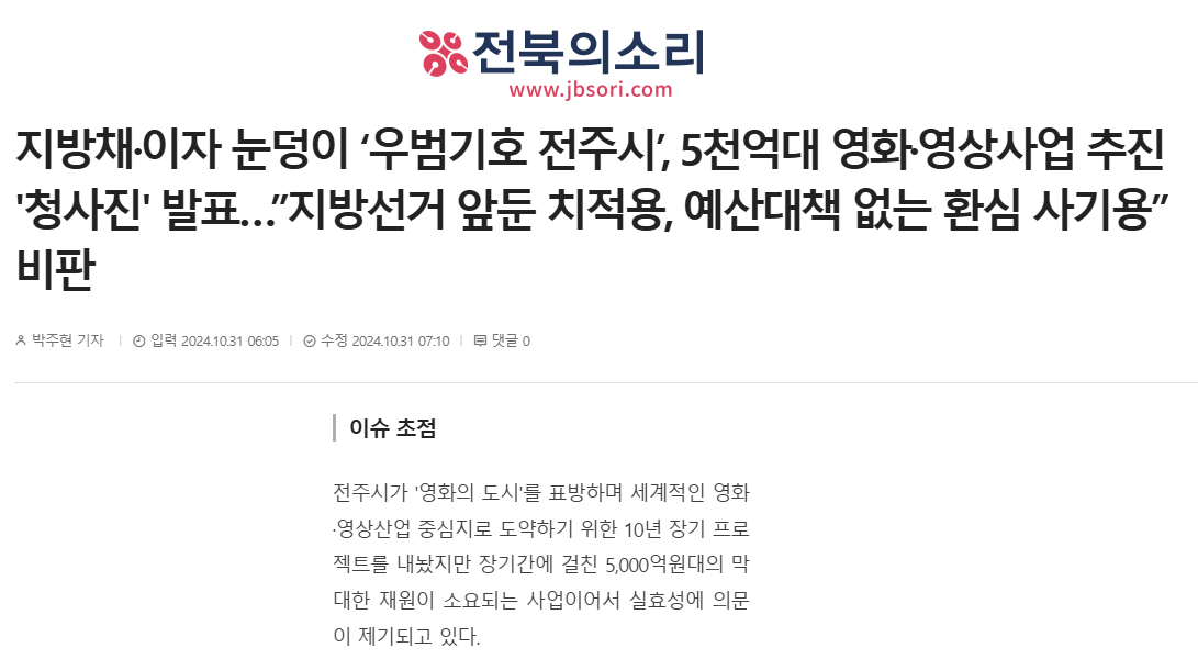 전북의소리는 이처럼 좋지 않은 상황에서 전주시가 대규모 영화 산업 투자 계획을 발표한 걸 두고 “전시 또는 탁상행정에서 비롯된 것 아니냐”, “다음 지방선거를 앞둔 치적 내세우기, 환심 사기용”이라고 비판하기도 했습니다.