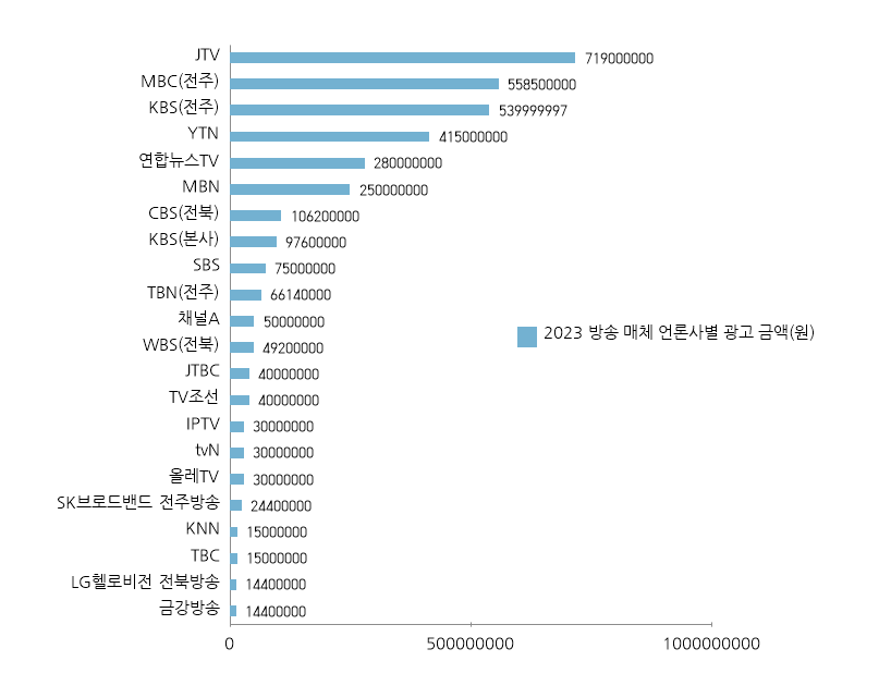 ■ 방송 매체, 도내 방송사에서는 JTV 1위, 종합편성 채널 및 전국방송 광고비 집행액 늘어