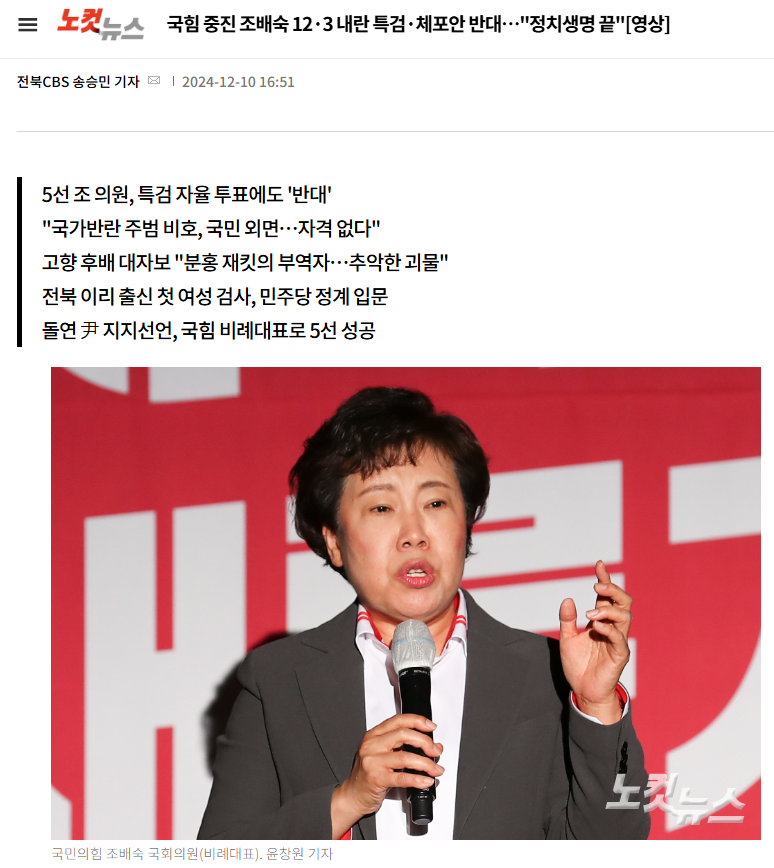 [노컷뉴스 전북] 국힘 중진 조배숙 12·3 내란 특검·체포안 반대…"정치생명 끝"(12/10, 송승민)