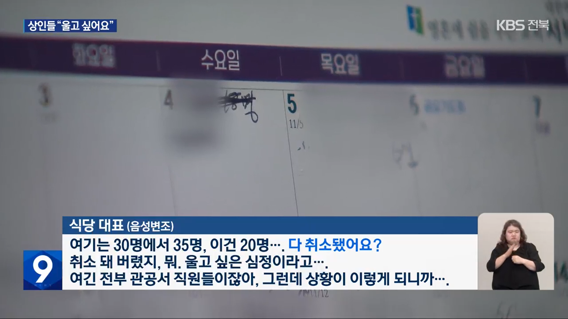 12월 9일 KBS전주총국도 식당 예약 취소가 이어지고 있고, 연말 반짝 대목을 기다린 전통시장도 얼어붙고 있다면서 고환율, 고물가, 고금리에 이어 정치적 불안 요소까지 겹쳐 연말 상권이 벼랑 끝으로 내몰리고 있다고 보도했습니다.