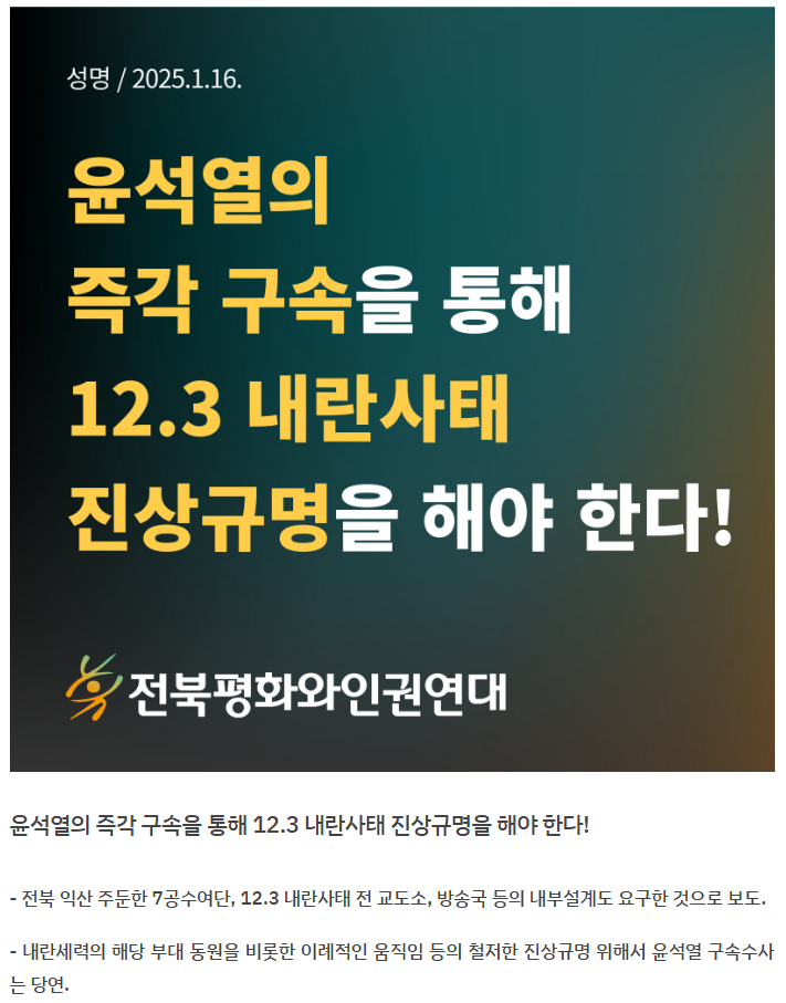 [전북평화와인권연대 성명] 윤석열의 즉각 구속을 통해 12.3 내란 사태 진상규명을 해야 한다!(1/16)