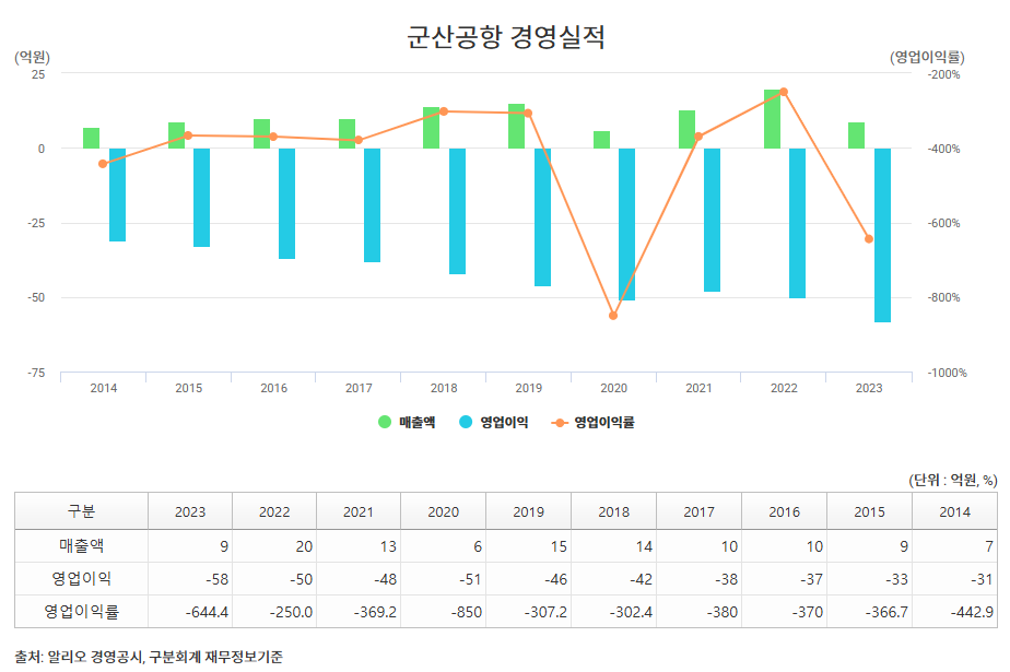 국토교통부에서 운영하고 있는 항공정보포털시스템에서 확인할 수 있는 ‘우리나라 항공산업현황’에 따르면 2023년 기준 군산공항의 매출액은 9억 원, 영업이익은 -58억 원, 영업이익률은 -644.4%를 기록했습니다. 2월 1일 KBS전주총국 보도에 따르면 군산공항은 대구공항과 원주공항에 이어 세 번째로 손실이 적어 지방공항 중에서는 그나마 사정이 나은 편이지만, 통계 자료를 보면 2014년부터 지금까지 꾸준히 적자를 기록한 것으로 나타납니다.
