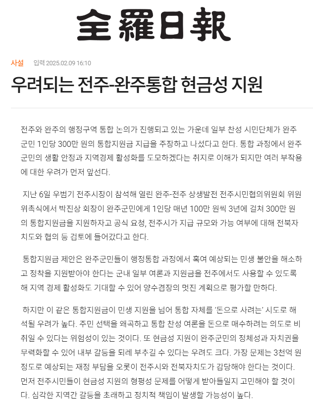 [전라일보] 우려되는 전주-완주통합 현금성 지원(15면, 사설)