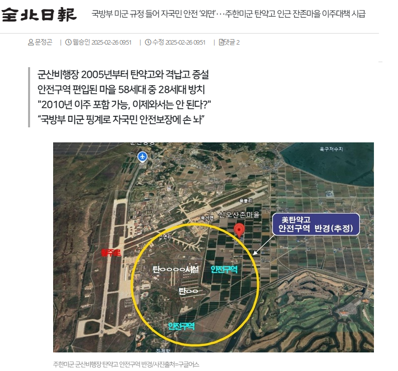 2월 27일 전북일보는 “군산비행장은 주한미군 군사시설이며, 지난 2005년부터 해마다 탄약고와 격납고를 증설하고 있다.”, “문제는 언제든 폭발할 위험이 있는 탄약고와 인근 마을간 충분한 안전거리가 확보되지 않으면 폭발 사고로 인해 주민의 생명과 재산에 큰 피해를 줄 수 있다는 점”이라고 보도했습니다.