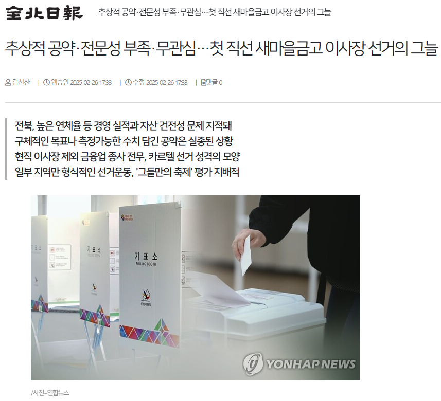 [전북일보 인터넷] 추상적 공약·전문성 부족·무관심…첫 직선 새마을금고 이사장 선거의 그늘(2/26, 김선찬)