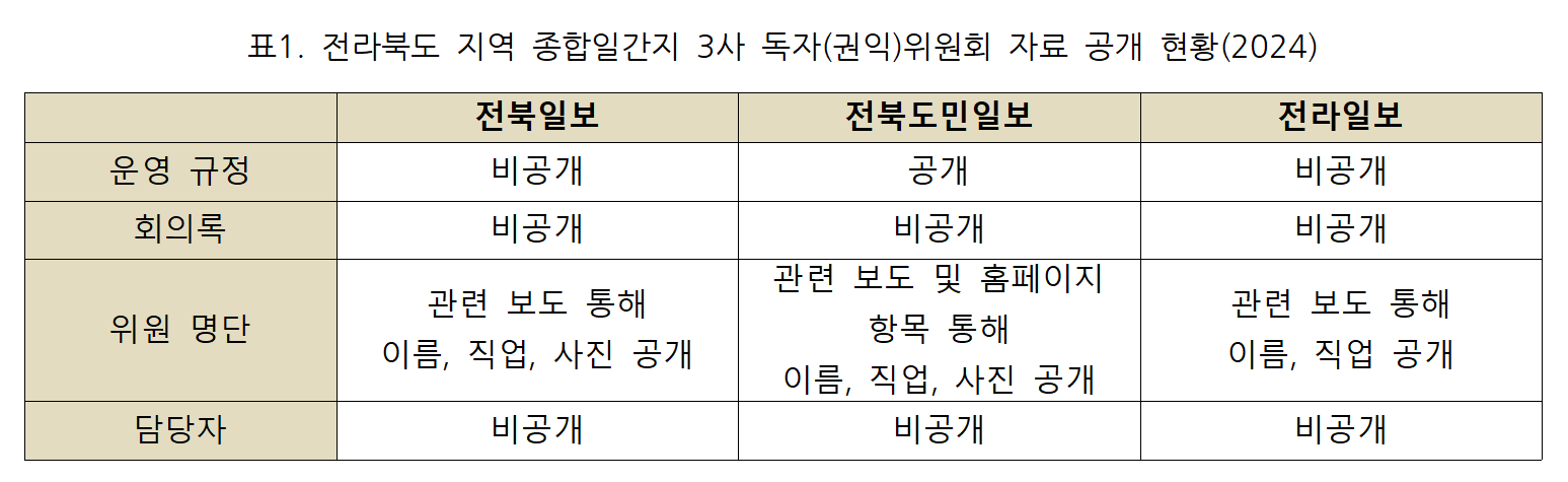 세 지역 일간지 중 독자(권익)위원회 회의와 관련된 기사를 제외하고 별도의 홈페이지 카테고리를 통해 독자위원회 관련 정보(운영원칙, 2014년부터 현재까지 독자위원 명단 등)를 공개하고 있는 곳은 전북도민일보뿐이었다. 다만 시청자위원회 관련 정보를 공개하고 있는 전북 지역 방송사(KBS전주총국, 전주MBC, JTV전주방송)와 비교했을 때 전북도민일보는 회의록이 아니라 회의 내용을 보도한 기사를 별도로 정리해 공개하고 있는 차이점이 있다.