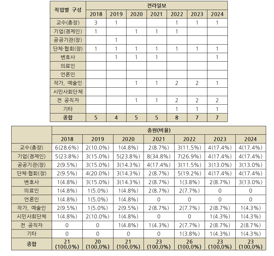 2023년과 비교해 2024년 전북 지역종합일간지 3사의 독자(권익)위원회 구성이 크게 바뀌지 않아서, 직업별 구성 현황도 전체적으로 큰 변화가 없다.