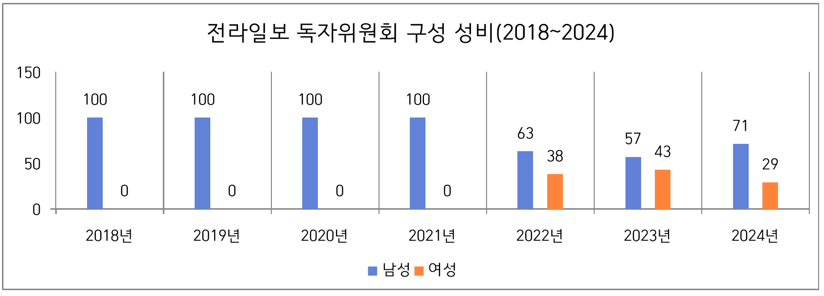 신문사별로 살펴보면 전북일보는 독자권익위원회 변화가 없어 성비도 그대로 유지됐다.