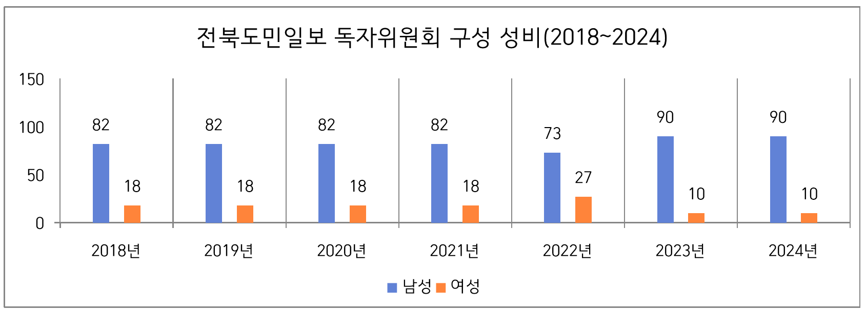 2023년과 비교해 2024년 전북 지역종합일간지 3사의 독자(권익)위원회 구성이 크게 바뀌지 않아서, 2018년부터 2024년까지 7년 평균 성비 구성은 남성 81%(127명), 여성 19%(30명)로 여전히 남성 독자위원의 비율이 매우 높은 것으로 나타났다.
