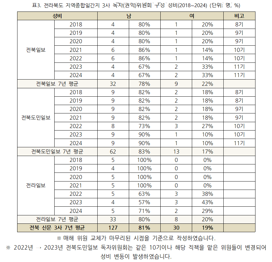 2023년과 비교해 2024년 전북 지역종합일간지 3사의 독자(권익)위원회 구성이 크게 바뀌지 않아서, 2018년부터 2024년까지 7년 평균 성비 구성은 남성 81%(127명), 여성 19%(30명)로 여전히 남성 독자위원의 비율이 매우 높은 것으로 나타났다.