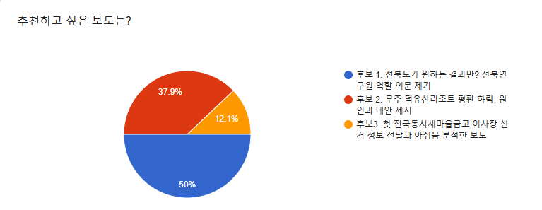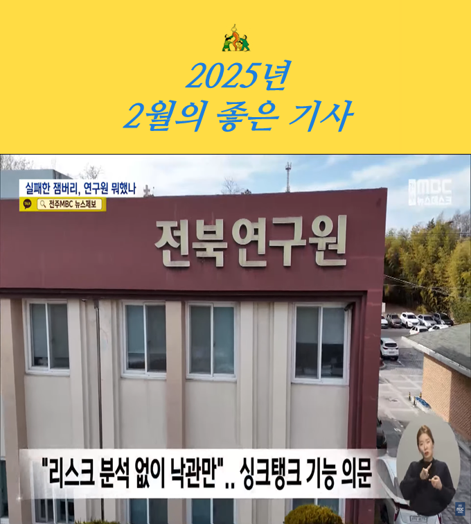세 개의 후보 중 <전북도가 원하는 결과만? 전북연구원 역할 의문 제기> 전주MBC 보도가 50.0%의 투표를 받아 2025년 2월의 좋은 기사로 선정되었습니다. 축하드립니다.