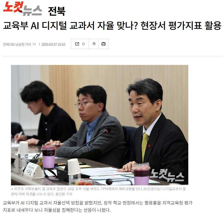 [노컷뉴스 전북] 교육부 AI 디지털 교과서 자율 맞나? 현장서 평가지표 활용(3/27, 남승현)