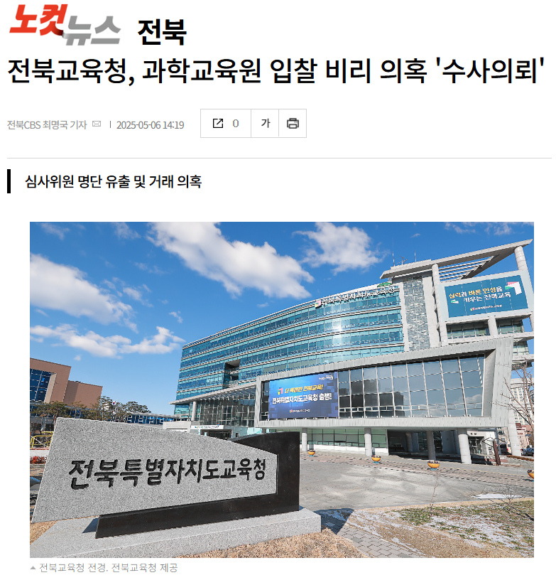 전북과학교육원의 입찰 비리 의혹에 대해 4월 28일 전북자치도교육청이 경찰에 수사를 의뢰했다는 소식을 지역 언론들이 일제히 보도했습니다. 전북과학교육원이 41억 원 규모의 전시체험관 설치 사업을 추진하기 위해 업체 입찰 공고를 냈는데, 이 과정에서 심사위원 명단을 주겠다며 입찰에 참여한 업체 측에 금품을 요구하는 브로커의 행적이 드러난 건데요.
