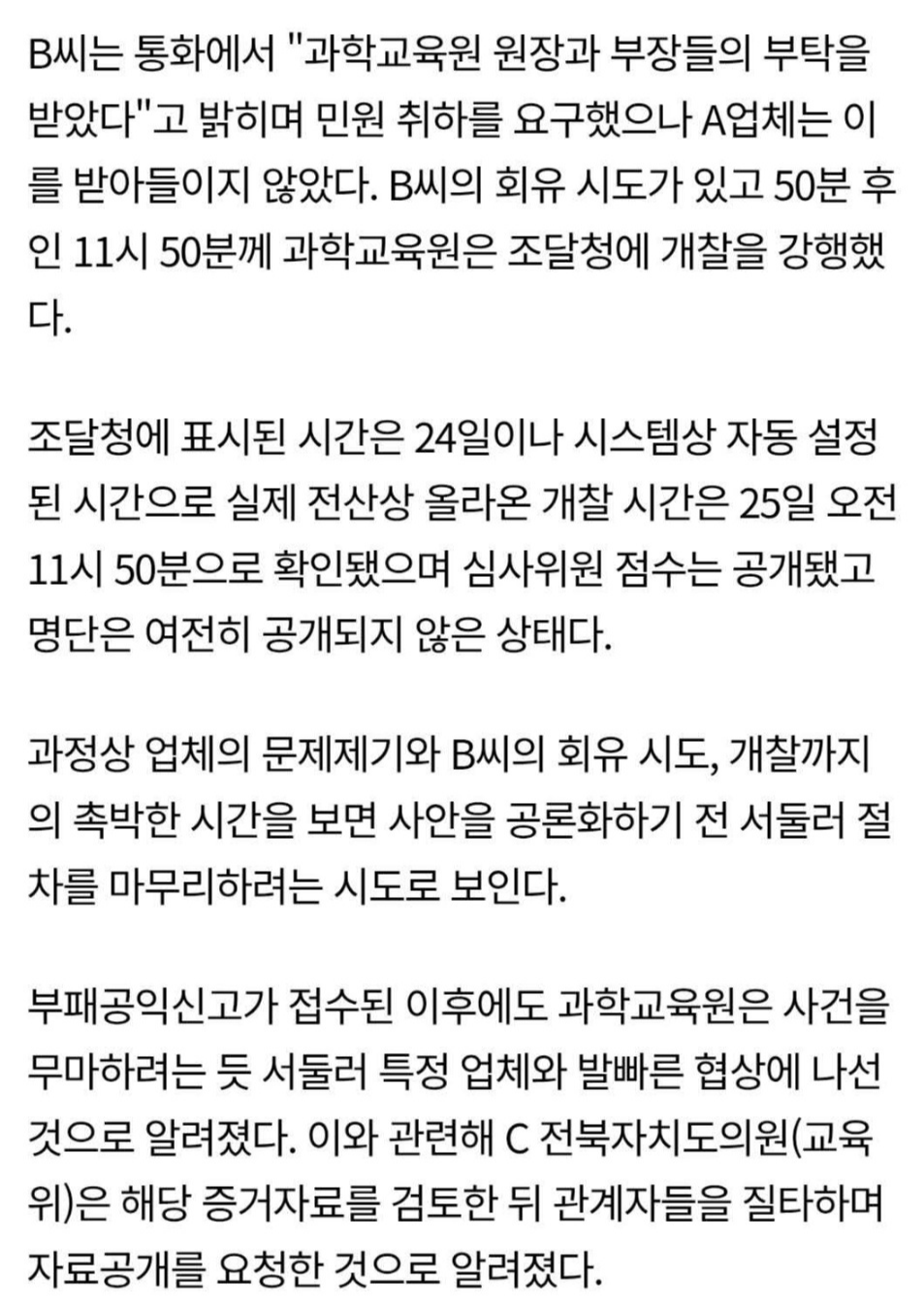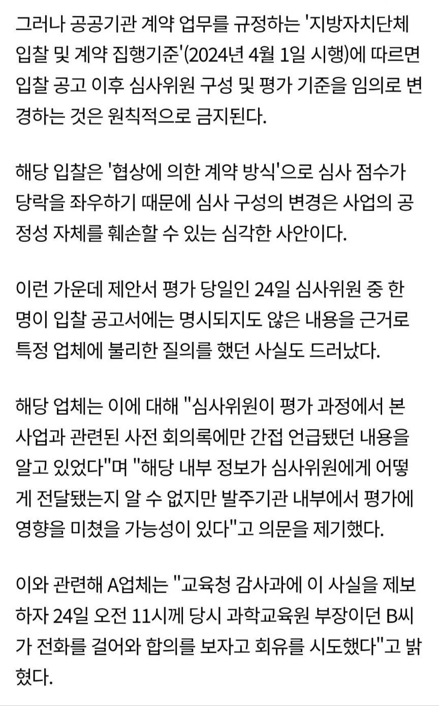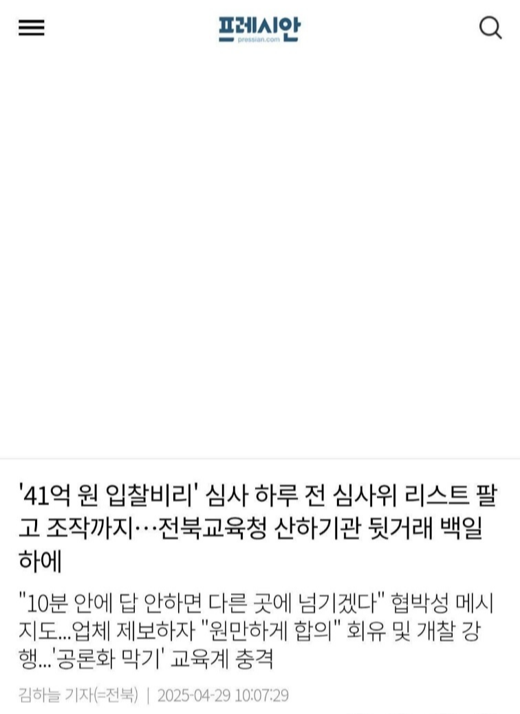 [프레시안] ‘41억 원 입찰비리’ 심사 하루 전 심사위 리스트 팔고 조작까지... 전북교육청 산하기관 뒷거래 백일하에(4/29, 김하늘) - 현재 삭제