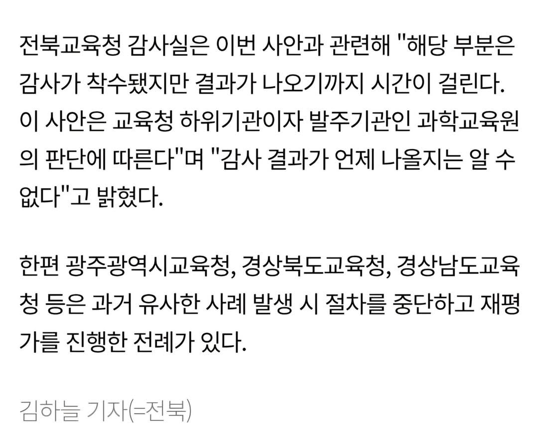 전북자치도교육청 감사관실은 감사만으로는 의혹을 밝히기에 한계가 있고, 전북과학교육원 내부에서 명단이 유출된 것인지 아니면 해당 브로커의 독단 행동인지 철저한 수사가 필요하다며 경찰에 수사를 의뢰했다고 밝혔습니다. 동시에 전북과학교육원에 대한 감사도 진행하고 있습니다.