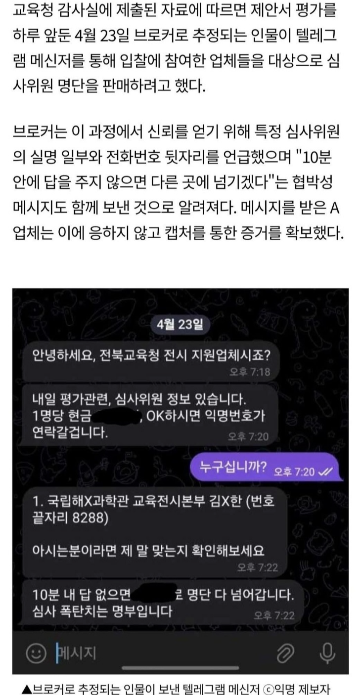5월 6일 전북CBS 노컷뉴스는 “제안서 평가를 하루 앞둔 지난달 23일, 입찰 참여 업체의 한 관계자는 텔레그램을 통해 심사위원 명단 거래 제안을 받았다. 특정되지 않은 이 메시지 발신자는 한 심사위원의 실명 일부와 전화번호 뒷자리 등을 언급하며 ‘10분 안에 답을 주지 않으면 다른 곳에 (심사위원 명단을) 넘기겠다.’라고 압박한 것으로 전해졌다.”, “심사위원 구성이 기존 ‘도내 5명, 도외 2명’에서 제안서 평가를 이틀 앞두고 ‘도내 4명, 도외 3명’으로 뒤늦게 바뀐 것도 논란을 불렀다.”라며 관련 제안을 받은 입찰 참여 업체의 제보를 통해 이번 사건이 드러났다고 좀 더 자세한 배경을 보도했습니다.