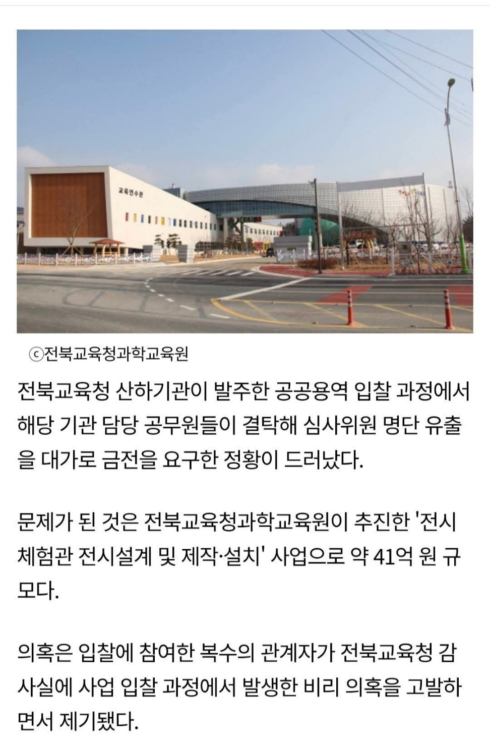 전북과학교육원의 입찰 비리 의혹에 대해 4월 28일 전북자치도교육청이 경찰에 수사를 의뢰했다는 소식을 지역 언론들이 일제히 보도했습니다. 전북과학교육원이 41억 원 규모의 전시체험관 설치 사업을 추진하기 위해 업체 입찰 공고를 냈는데, 이 과정에서 심사위원 명단을 주겠다며 입찰에 참여한 업체 측에 금품을 요구하는 브로커의 행적이 드러난 건데요.