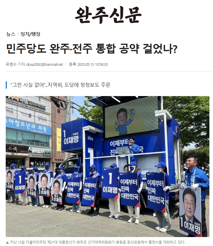 “더불어민주당 완주지역위원회 관계자는 해당 기사에 대해 ‘완주·전주 통합을 공약으로 걸기 위해서는 지역위와 상의 없이는 불가능한 일’이라며, ‘완주·전주 통합을 민주당에서 대선 공약으로 발표하거나 논의한 적이 없다’라고 말했다.”라고 보도했습니다. 전북일보가 보도한 ‘민주당도 완주-전주 통합을 대선 공약으로 발표했다.’라는 내용이 사실이 아니라는 것입니다.