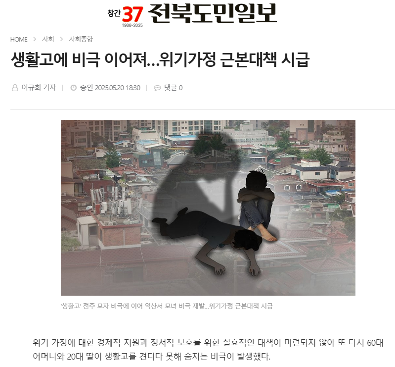 오늘 자 전북도민일보는 “2023년 9월 전주에서 40대 어머니가 생활고를 겪다 숨진 채 발견됐고 함께 있던 4살배기 아들이 의식을 잃은 채 구조되는 사고가 발생한 지 1년 8개월 만이다. 복지 사각지대에 놓인 위기 가정의 비극이 반복됐다.”라며 반복된 비극이 보여주는 현행 복지 제도의 한계를 지적했습니다. 해당 기사에서 서정희 군산대학교 사회복지학과 교수는 “수급자가 꾸준히 자신의 빈곤 상태와 근로 능력 등을 입증해야 하는 구조로 한계가 명확”해 보편적인 복지 정책으로 전환이 필요하다고 주장했습니다.