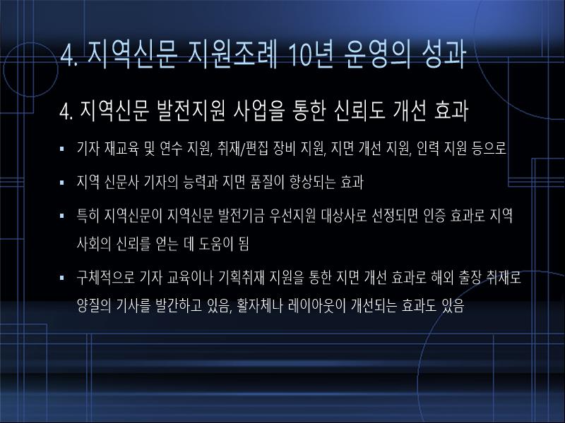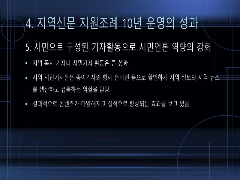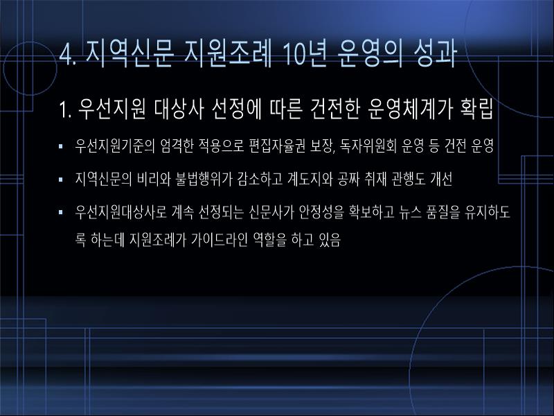 그는 “경남 지역신문 조례를 통해 편집자율권 장치와 독자위원회 등 지역신문 제도를 정착시키고 신문사 지배주주 및 임원의 불법행위 여부를 기금 선정기준으로 정하고 우선지원 대상사의 자정 노력이 더해져 지역신문의 비리와 불법행위가 감소했다”고 말했다.