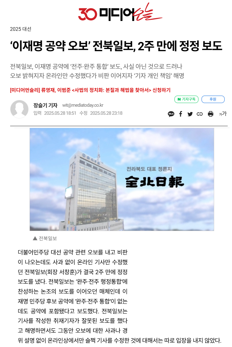 ※ 참고. [논평] 정정도 사과도 없이 슬그머니 기사만 수정하면 그만인가? 완주전주 통합 공약 관련 전북일보 오보에 대한 입장 (2025.05.23.)