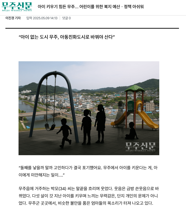 5월 12일 무주신문은 병원, 놀이터, 친구가 없는 동네에서 아이를 낳고 키우기 어렵다는 시민들의 말을 전달하면서, 무주군의 복지 정책이 미래를 놓치고 있다고 지적했습니다.