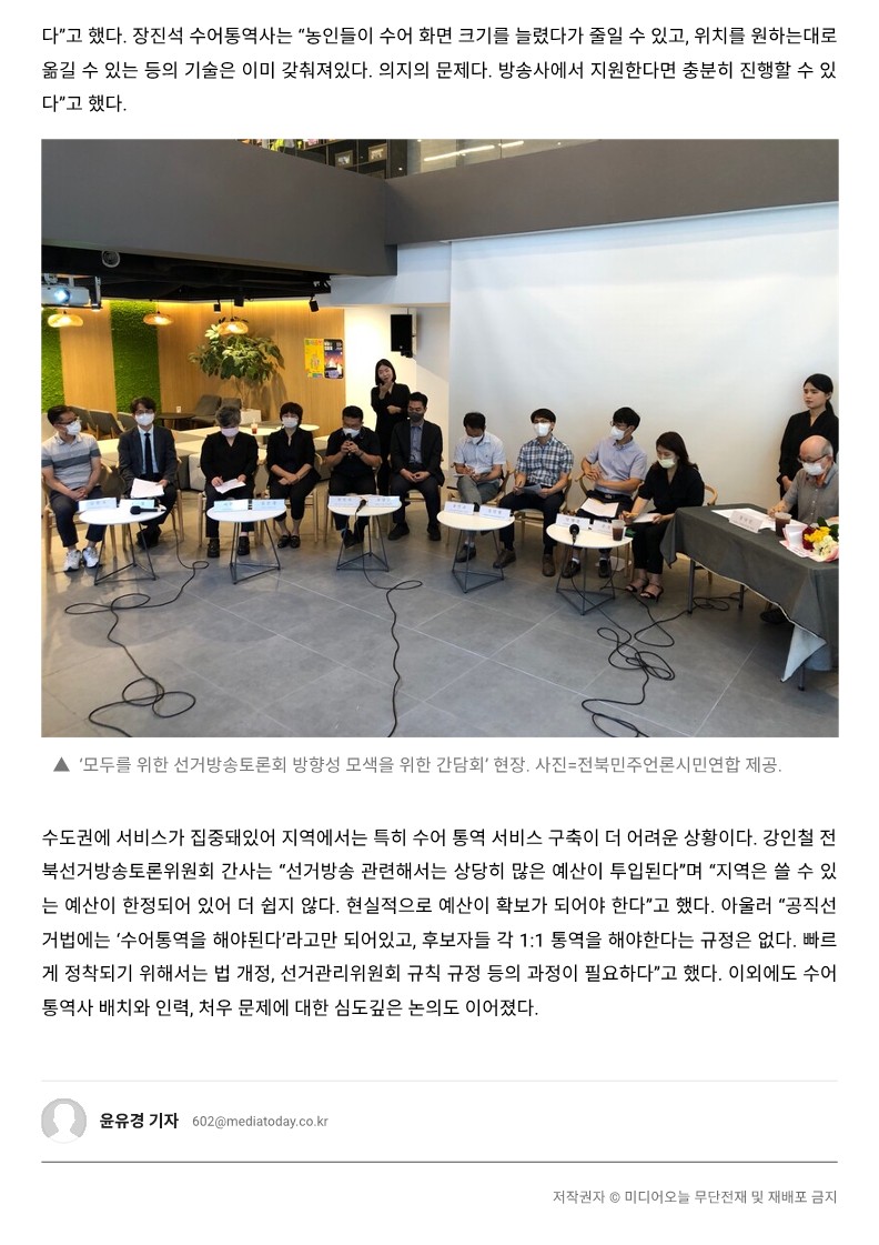 미디어 이용에 있어 비장애인과 장애인 모두의 권익을 증진시키기 위한 방안을 찾아보자는 취지로 진행되었던 '후보자별 1:1 수어통역사 배치 선거방송토론회' 유튜브 콘텐츠 제작에 이어, 14일 진행되었던 간담회. 지역에서의 장애인의 미디어 공론장을 어떻게 확보할 것인지, 그리고 선거방송토론회를 비롯한 콘텐츠에서 수어통역을 어떻게 확장할 것인지 다양한 의견들이 쏟아져 나왔습니다.