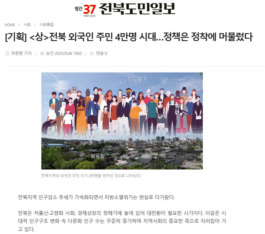 이 외에도 전북 지역만의 맞춤형 전략이 부족하고 국가사업 의존도가 높다는 점, 단순한 복지 형태의 지원에 집중되어 있다는 점 등을 지적하며 외국인을 전북 지역의 재생과 산업을 이끌 동반자로 바라보는 시각의 전환이 요구된다고 보도했습니다.