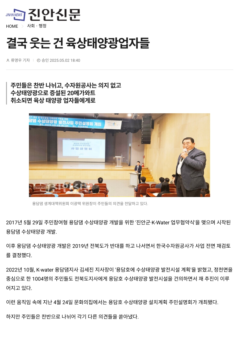 진안신문은 4월 24일 진행된 용담호 수상태양광 설치 계획 주민설명회 내용을 취재해 주민들의 찬반 입장을 같이 전달하는 한편, 사회적 합의를 위한 공론화 요구가 나왔다고 보도했습니다. 무엇보다 용담호 수상태양광 계획으로 인해 증설된 20MW 전력은 사업이 무산된다고 해도 그대로 남아 자칫 용량 허가 문제로 사업을 추진하기 어려운 다른 발전사업 업체들에게 돌아갈 수 있다는 점을 주요 문제점으로 언급했습니다.