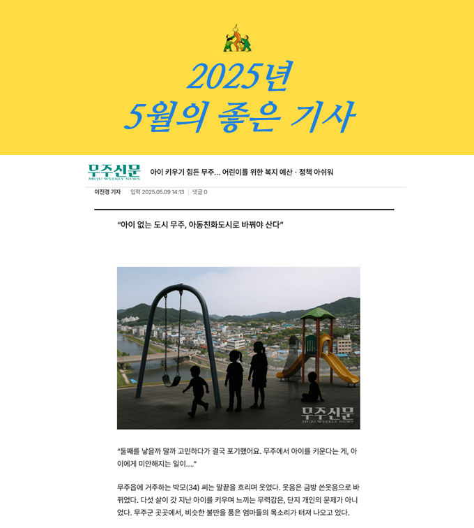 다섯 개의 후보 중 무주신문 <무주군 아동 복지 정책 부족한 점 연속 보도>가 36.4%의 투표를 받아 2025년 5월의 좋은 기사로 선정되었습니다. 축하드립니다.