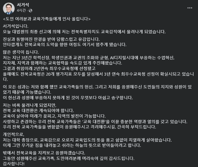 서거석 전 교육감은 판결 이후 페이스북 글을 통해 “저는 비록 물러나게 되었지만 전북 교육 대전환은 계속되어야 한다.”, “밖에서 전북교육을 지켜보고 응원하겠다. 도민 여러분께 감사드린다.”라고 밝혔습니다. 판결에 대해서는 “진실과 동떨어진 판결을 받아 당황스럽고 유감”이라고 밝혔습니다. 이와 관련해 전북CBS 노컷뉴스는 ‘불명예 퇴진’, ‘애써 웃음 짓는’이라는 썸네일과 함께 ‘당선무효형 선고에도 웃으며 나타난’이라는 제목을 통해 서 교육감 행보를 에둘러 비판하기도 했습니다.