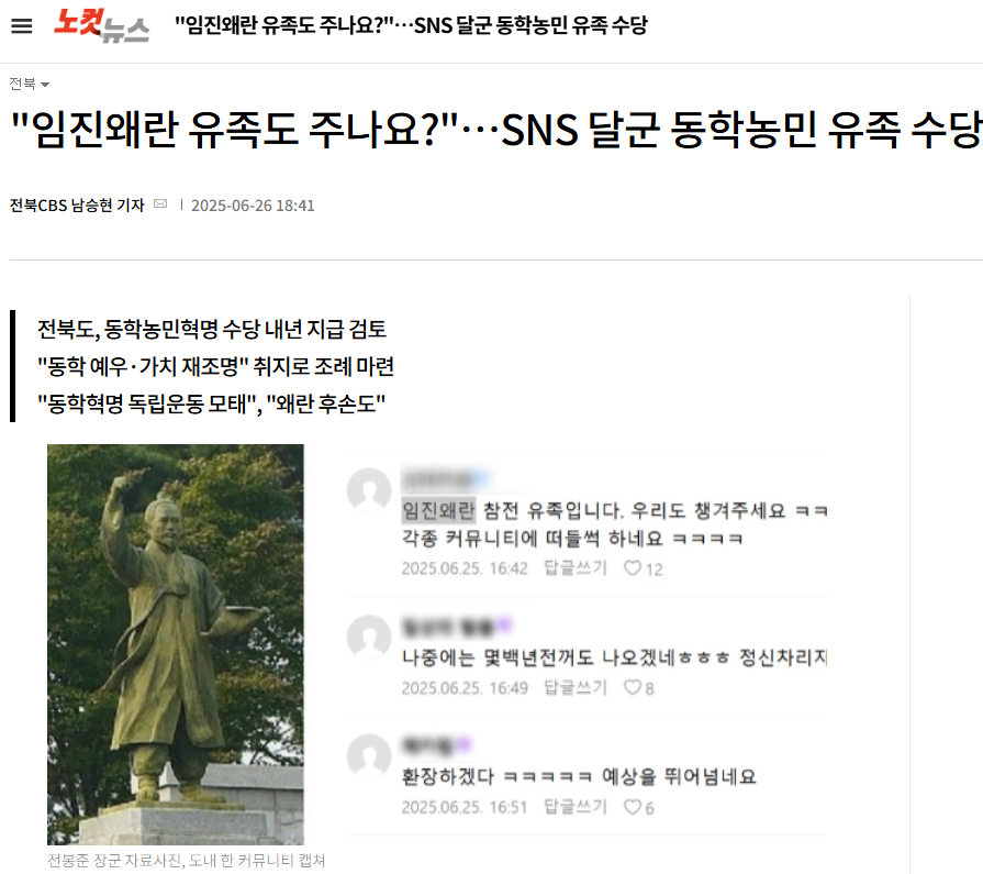 그런데 조례에 따라 전북자치도가 동학농민혁명 유족 수당 지급을 검토하고 있다는 소식이 알려지자 찬성과 반대 의견이 엇갈리고 있습니다. 6월 26일 전북CBS 노컷뉴스는 “동학혁명이 독립운동이 모태가 된다며 유족 수당이 필요하다는 의견과 함께 그렇다면 임진왜란에 참여한 조상의 유족도 지원금을 줘야 한다는 견해가 맞서고 있다.”라고 보도했는데요. 앞서 전북자치도의회에서 다른 역사적 사건과의 형평성 문제에 대한 우려가 나왔는데 논란이 발생한 겁니다.