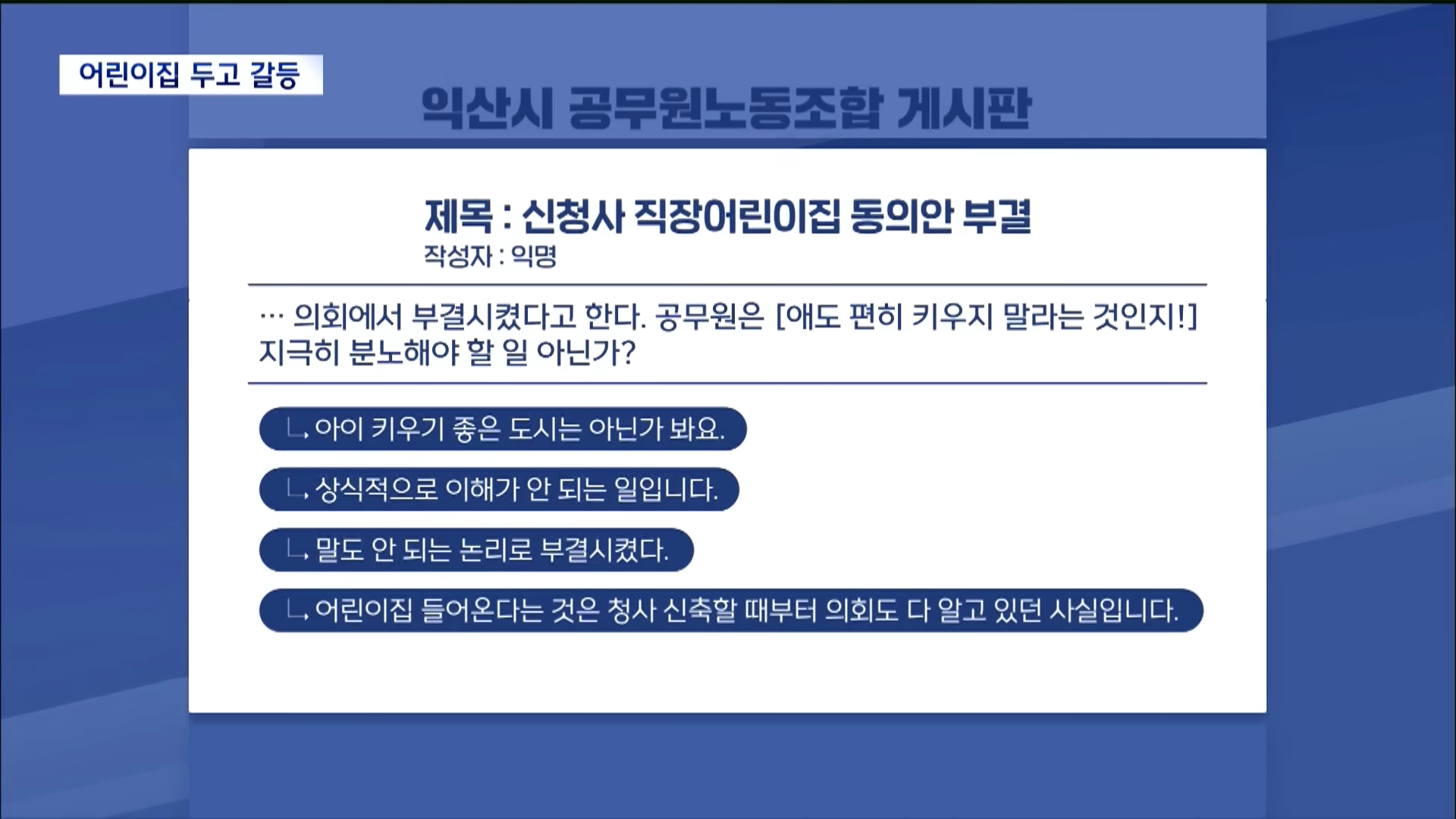 그러나 익산시의회의 결정에 공무원들을 중심으로 반발이 이어졌다는 지역 언론들의 보도가 나왔습니다. 6월 18일 전북CBS 노컷뉴스는 익산시 공무원 노조 게시판을 중심으로 ‘시청 내 어린이집은 설치 의무가 있는데 부결한 것은 공무원들 애도 편히 키우지 말라는 것’, ‘시의원들 자식들이 다 장성해서 공감하지 못하는 것 같다.’, ‘어린이집 설치로 주차장이 부족하다는 것은 상식적으로 이해가 안 간다’ 등의 글이 올라왔다고 보도했습니다.