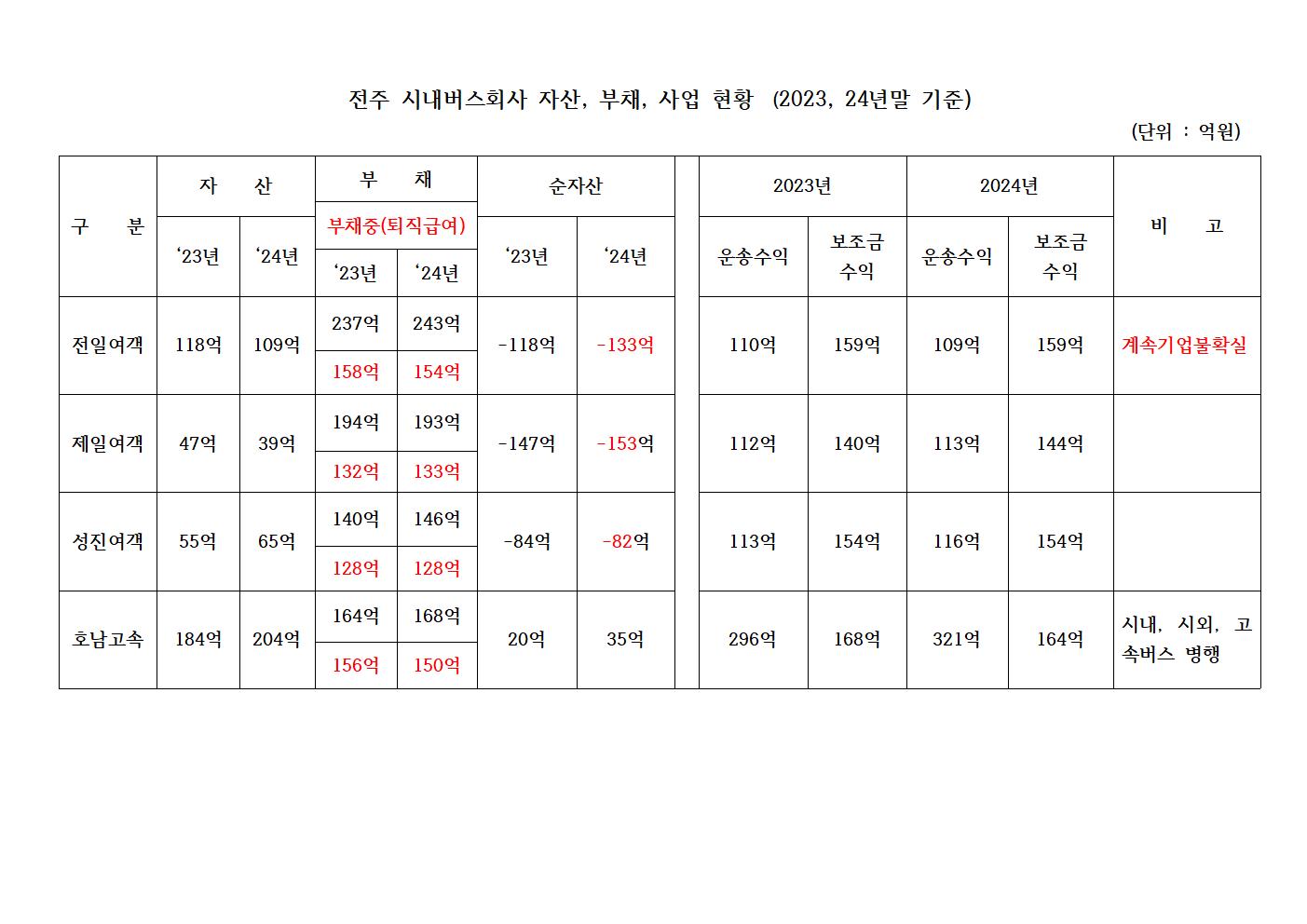 버스업계의 어려움을 이유로 버스 요금 인상을 추진하고 있지만, 200원 증가로는 큰 의미가 없다는 주장도 나왔습니다. 7월 15일 전주시민회는 금융감독원 전자공시시스템에 공개된 자료를 바탕으로 2023년, 2024년 전주 시내버스회사의 자산‧부채 현황을 정리해 공개했는데요. “호남고속을 제외한 나머지 시내버스회사들은 언제 청산되어도 의문이 들지 않을 만큼 부실한 기업들”이라며, “각 버스회사들의 운송수입을 보면 지방자치단체가 지급하는 보조금 수입보다 훨씬 적다. 8월부터 전북도의 모든 버스 요금을 올려도 효과가 없다는 것”이라고 주장했습니다.
