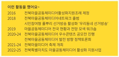 마을미디어의 공익성을 살려 행정 차원의 지원이 필요하다는 점을 주장해왔고, 2016년 만들어진 전라북도 마을공동체미디어 활성화 지원 조례가 유명무실하다는 점을 지적해 전북도 차원의 마을공동체미디어 지원 사업이 이루어질 수 있도록 활동을 해왔습니다.