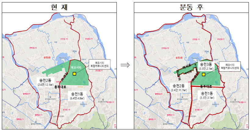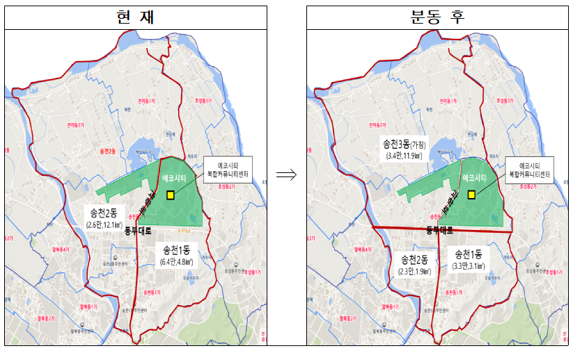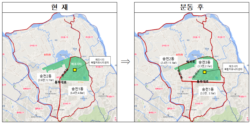 1안 - 동부대로 경계로 북측 전체(에코시티, 전미동, 송천2동 일부 포함)를 송천 3동으로 분동