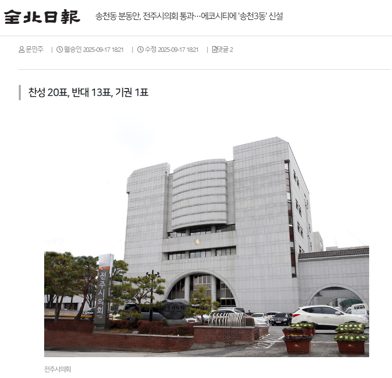 [전북일보 인터넷] 송천동 분동안, 전주시의회 통과⋯에코시티에 '송천3동' 신설(9/17, 문민주)