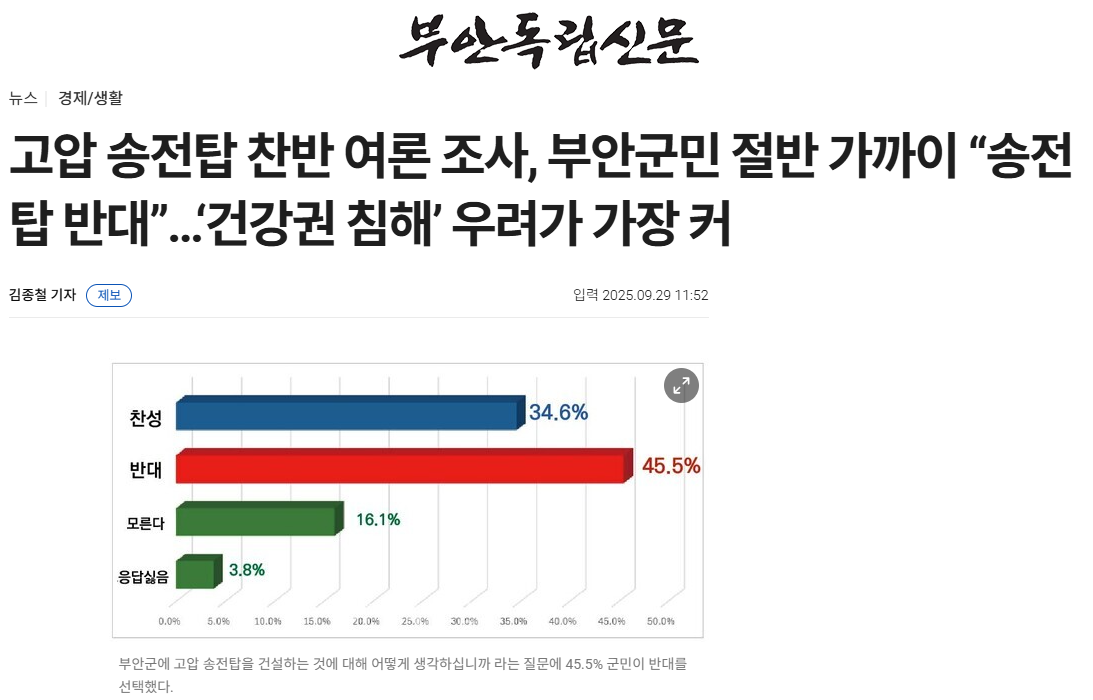 11. 고압 송전탑 찬반 여론 조사, 부안군민 절반 가까이 “송전탑 반대”…‘건강권 침해’ 우려가 가장 커(9/29, 김종철 취재기자)