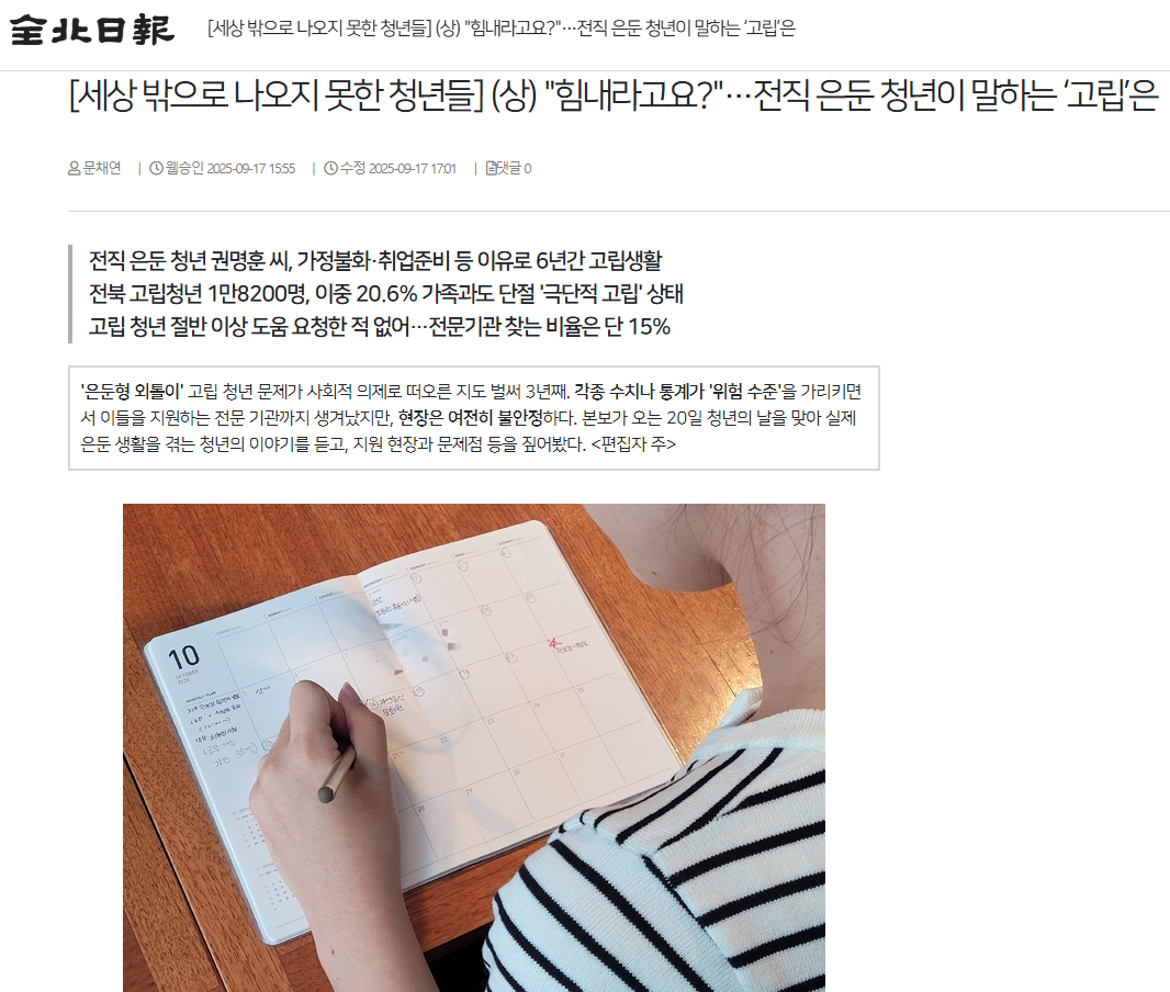 전북일보는 9월 20일 청년의 날을 맞아 실제 은둔 생활을 겪는 청년들의 이야기를 듣고, 지원 확대와 문제 해결책을 살펴보는 연속 보도를 진행했습니다. 전북연구원 조사 결과 지난해 7월 기준 도내 고립 청년은 약 1만 8200명인데요, 이중 약 20%는 가족‧친척과도 만나지 않는 극단적 고립 상태에 놓여 전국 평균보다 높다고 보도했습니다. 원인은 일자리가 가장 많고, 대인 관계 문제와 따돌림‧괴롭힘‧폭력 등의 순서로 나타났습니다.