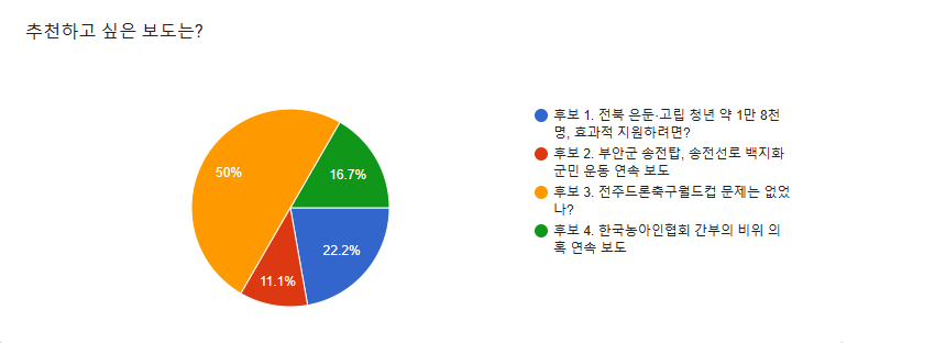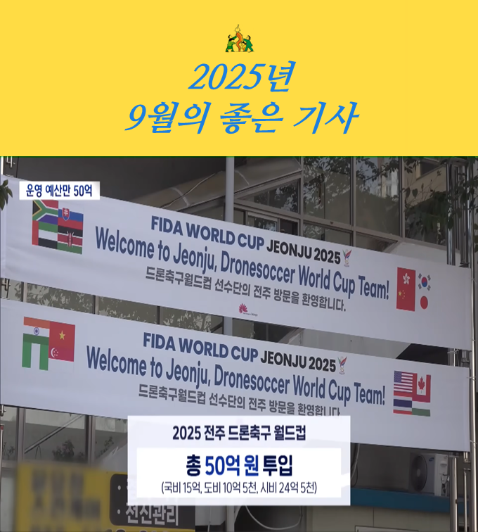 네 개의 후보 중 전주MBC <전주드론축구월드컵 문제는 없었나?> 보도가 50.0%의 투표를 받아 2025년 9월의 좋은 기사로 선정되었습니다. 축하드립니다.