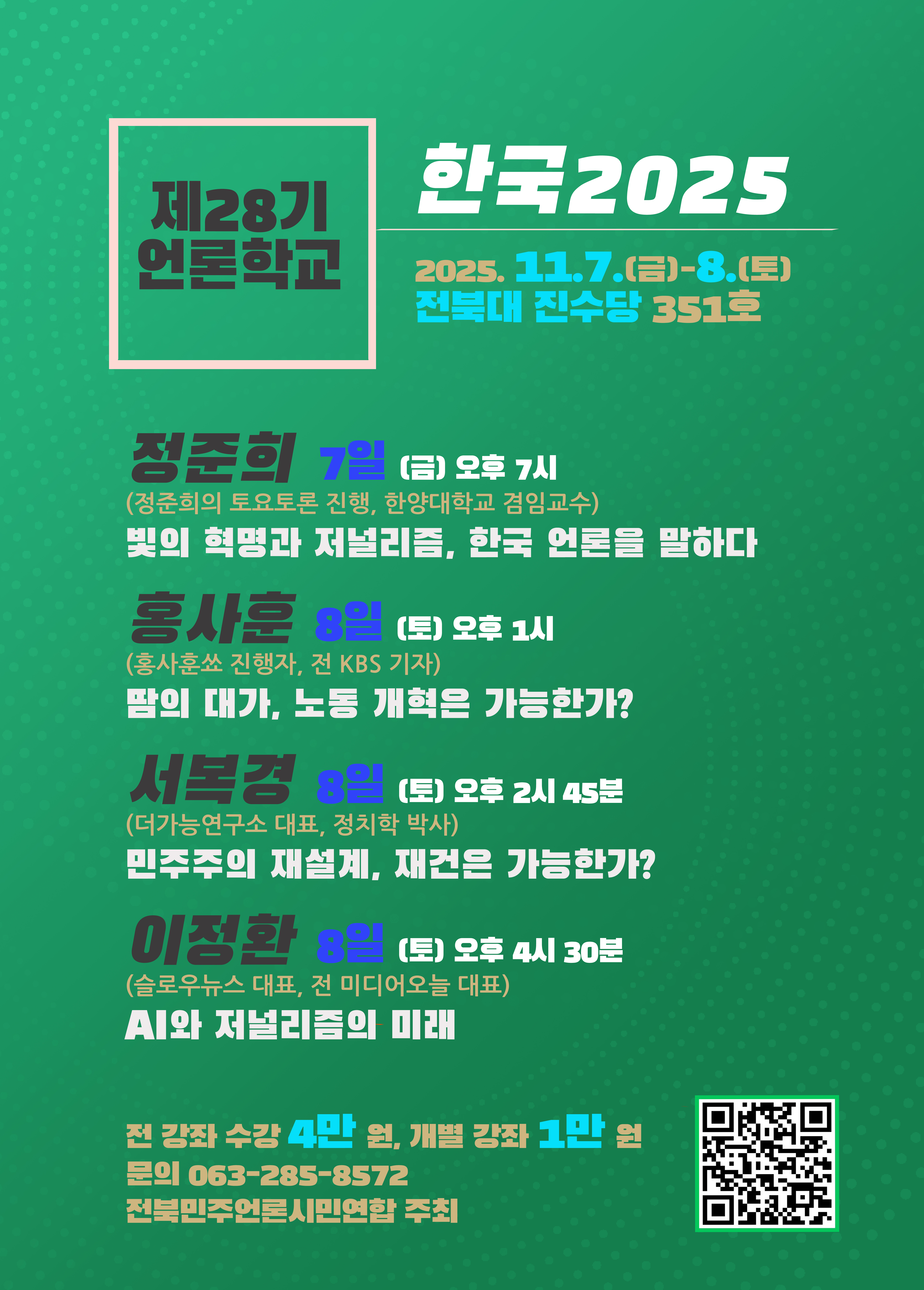 전북민언련 제28기 언론학교 📌 2025년 11월 7일(금) 오후 7시, 8일(토) 오후 1시-6시/ 전북대 진수당 351호(3층) 📌 언론 현안에 관심 있는 일반 시민 모두 가능 (선착순 접수) 📌 전체 수강 4만 원, 개