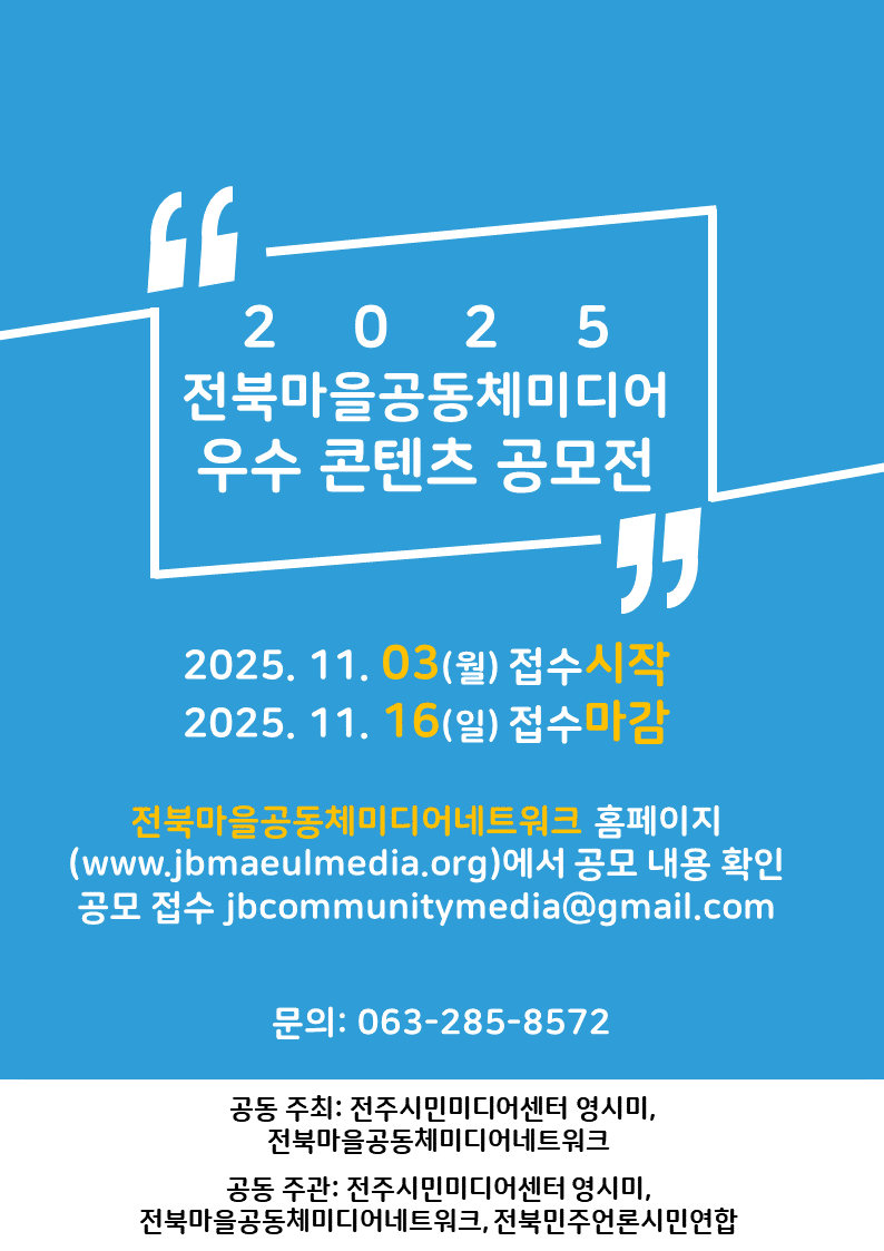 | 2025 전북마을공동체미디어 우수 콘텐츠 공모전 심사 결과 안내 (0) | 2025.11.21 |