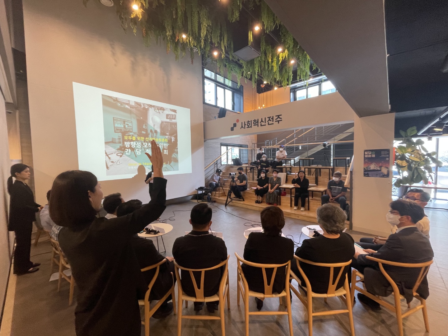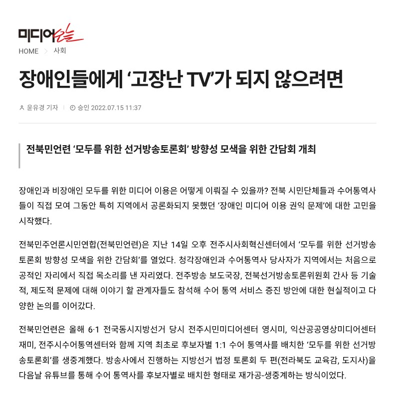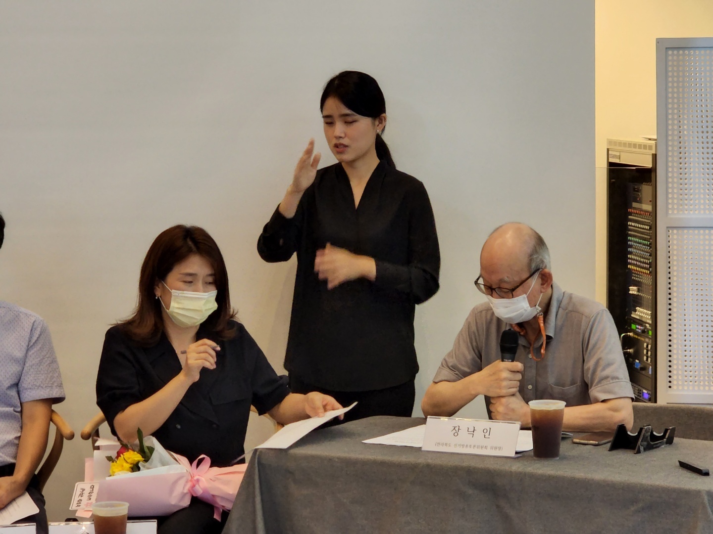 오늘 이 자리가 있게 된 건 그동안 지역사회에서 시민들의 미디어 이용 권익을 위해 애써왔던 전주시민미디어센터와 익산공공영상미디어센터가 흔쾌히 참여해 줬고, 전주시수어통역센터 선생님들이 헌신적으로 함께해 주셨던 자리여서 가능했습니다.