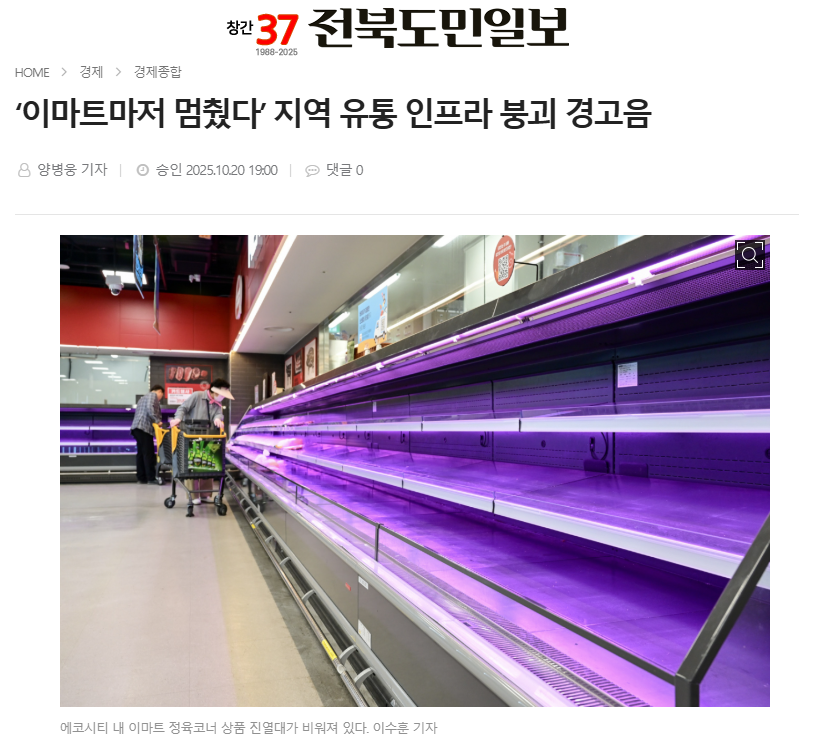 해당 기사에서 익명의 도내 유통업계 관계자는 “대형마트도 임차 구조에 기반한 만큼 부동산 시장의 불안이 유통 리스크로 번지는 건 시간문제”라고 주장했습니다. 소상공인뿐만 아니라 이마트와 같은 대형 유통 업체도 부동산 리스크를 피하기 어렵다는 분석, 지역 언론들이 연쇄적인 피해를 우려하고 있는 만큼 행정과 정치권 차원에서도 대책 마련이 필요해 보입니다.