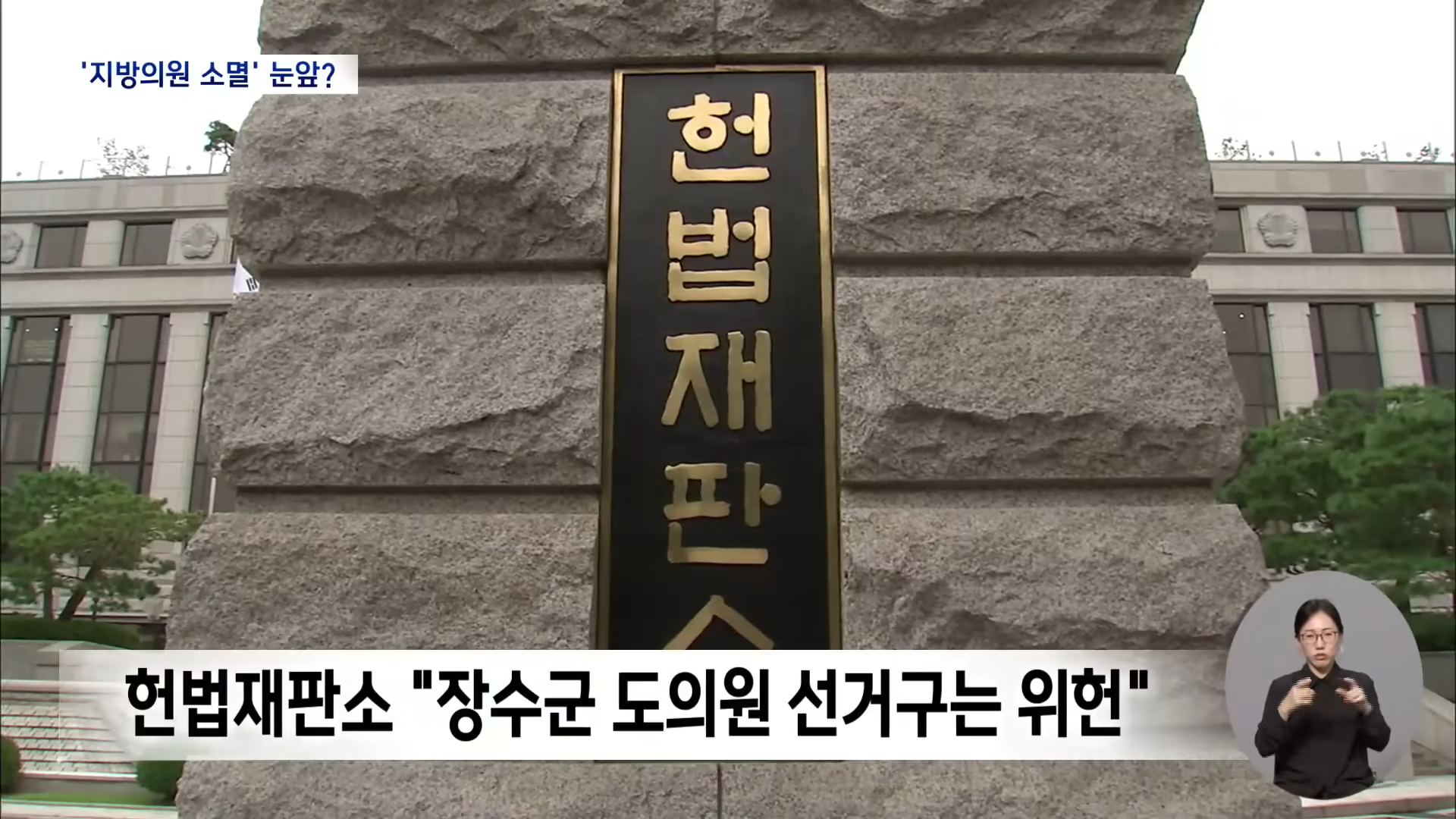2022년 지방선거 당시 장수군은 도의원 1명을 선출할 수 있도록 선거구가 정해졌는데요. 해당 선거구가 헌법상 허용 기준을 벗어났다는 헌법재판소의 판결이 나와 파장이 예상됩니다. 내년 2월 19일까지 선거구를 다시 정해야 하는데, 이에 일부 지역 언론들은 도의원 정수가 줄어들 우려가 크다며 지역 정치력과 농촌의 정치 대표성이 약화될 것이라고 보도했습니다.