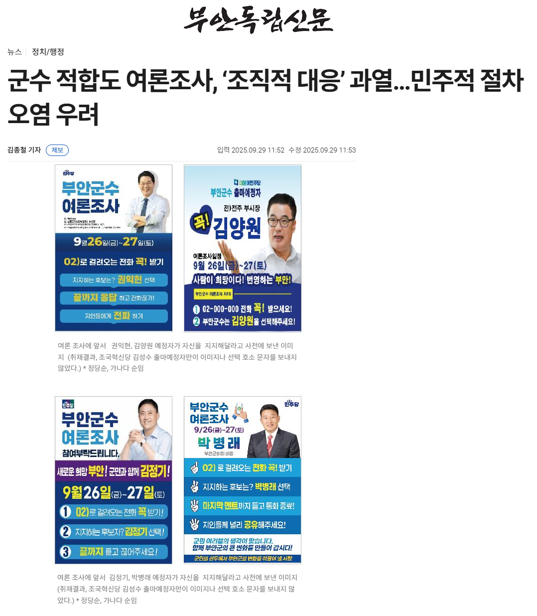 [부안독립신문] 군수 적합도 여론조사, ‘조직적 대응’ 과열... 민주적 절차 오염 우려(9/29, 2면, 김종철)