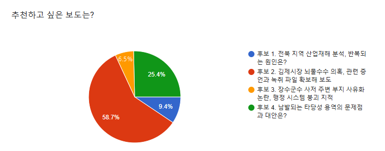 네 개의 후보 중 전주MBC <김제시장 뇌물수수 의혹, 관련 증언과 녹취 파일 확보해 보도>가 58.7%의 투표를 받아 2025년 10월의 좋은 기사로 선정되었습니다. 축하드립니다.
