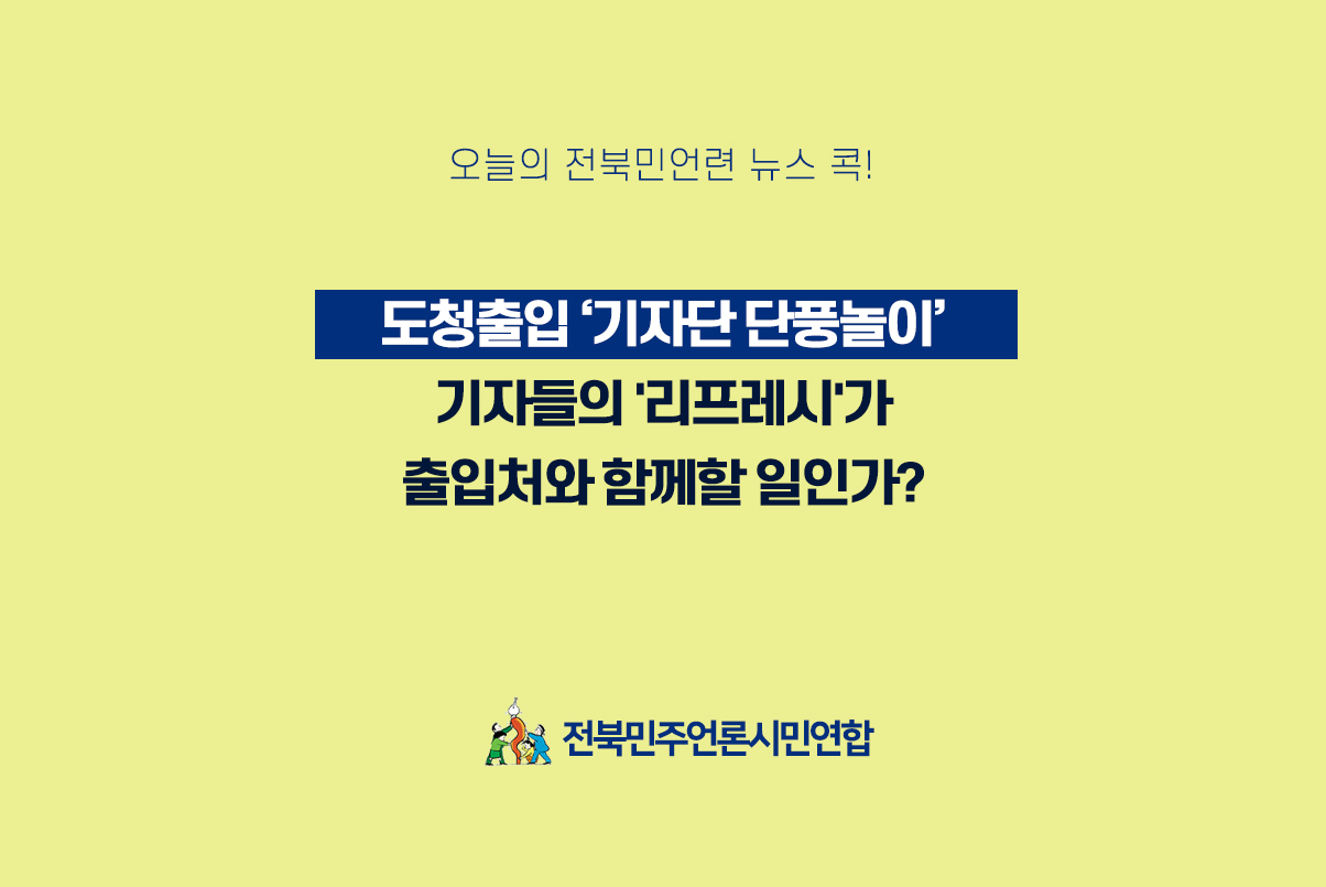 전북도청 출입기자단과 대변인실은 '공식 일정'이라는 이름으로 이뤄지는 친목 활동을 지양해야 합니다. 특히 기자단은 출입처와의 비판적 거리를 회복해 언론 윤리를 재정립해야 하지 않을까요? 분명한 건 기자들의 '리프레시'가 출입처와 함께할 일은 아니라는 것입니다.