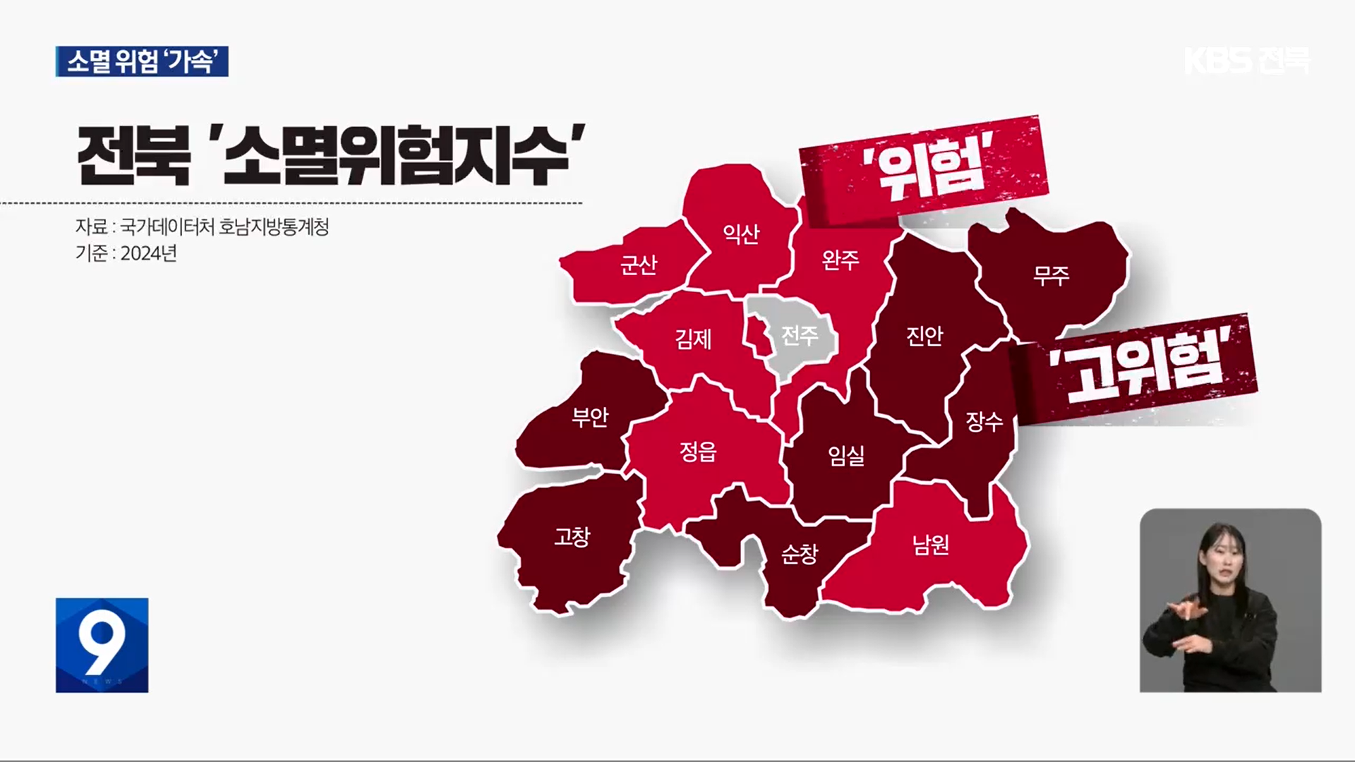 11월 22일 KBS전주총국은 “유소년과 청년 비율 모두 전국 평균보다 낮아 지방 소멸 위기를 부채질하고 있다. 특히 소멸 고위험 지역의 유소년과 청년 비율은 전북 평균과도 격차가 컸다.”라고 보도했는데요. 서병우 호남지방통계청 지역통계과장은 “고령화 비율같은 경우에 전국이 20.0%인데 전북은 25.3%, 고위험 시군은 39.3%를 보이고 있다.”, “일자리·교육·주거 등 정주 여건의 부족이라는 구조적인 문제와 연결되어 있는 것으로 보인다.”라고 결과를 분석했습니다.